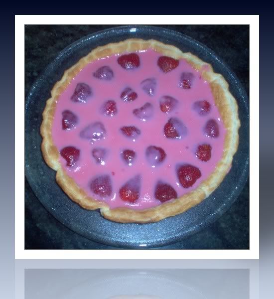 Depois de cozida retira-se do forno e deixa-se arrefecer. Corta-se os morangos em pedaços e coloca.se na tarteira.